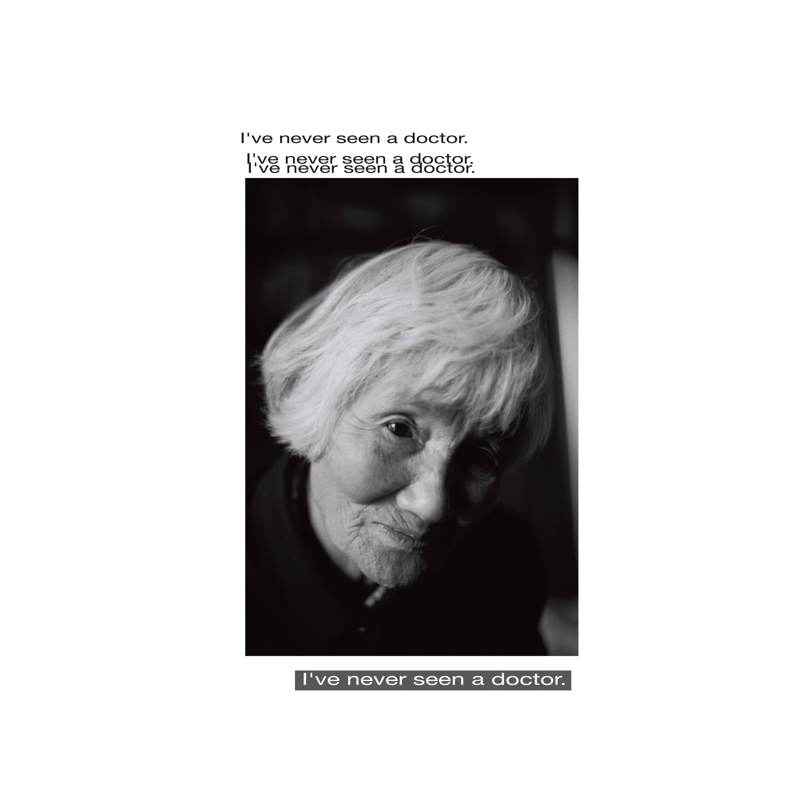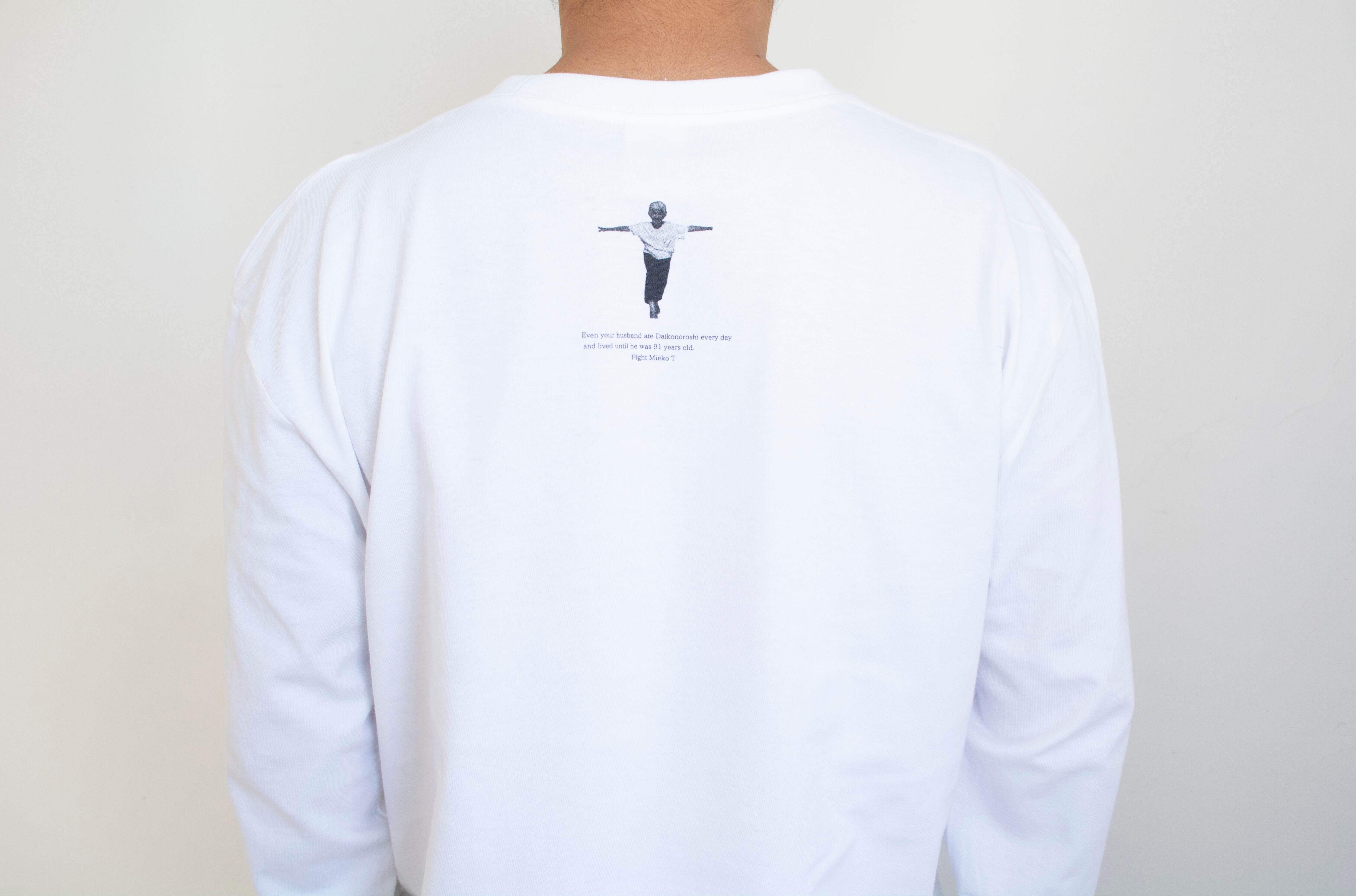 祖母美恵子(90)の元気を取り戻すべく作られたこのロンT。"わたしは一度もお医者に罹ったことがない"と言う美恵子の口癖をプリントしてます。これを見てあの頃の強気を思い出して!